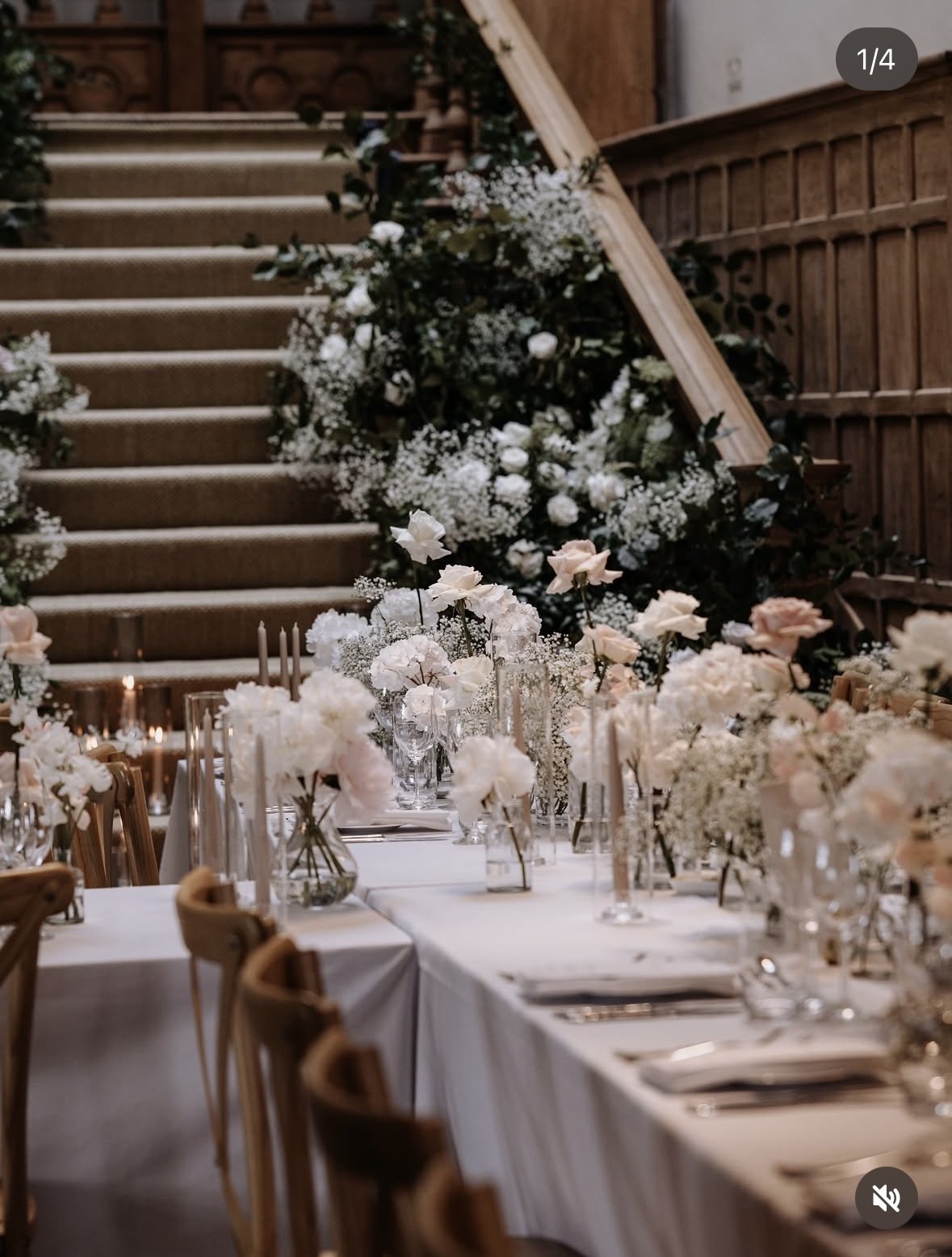 A high-impact stairway installation transformed the entrance, layering textured foliage, Roses and Delphinium into a sculptural cascade that complemented the grand interior. Reception tables were abundant, a mixture of bud vases filled with Peonies, Roses, Sweet Peas and Hydrangea clouds.